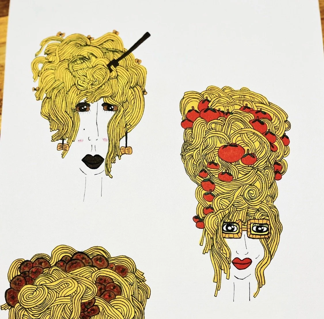 The series called ’ Pasta Ladies’ began from GGS’s obsession with all things pasta-making and consuming. Drawing ladies with such looks to include spaghetti hair, rigatoni and ravioli outfits, and farfalle accessories that has developed into an ongoing creative love affair. The development of GGS's Pasta Ladies into prints and t-shirts is certainly in the works, to be shared and enjoyed by all our pasta-consuming members.